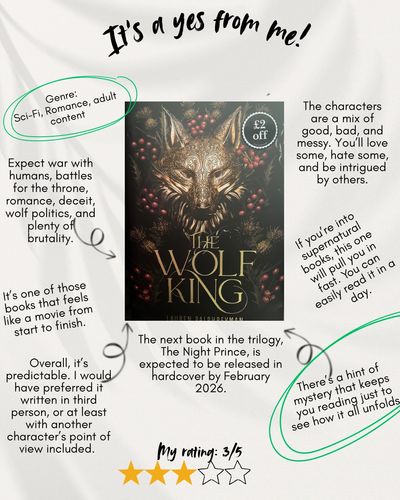 The Wolf King by Lauren Palphreyman is a Sci-fi Romance trilogy centered on the long-standing hatred between werewolves and humans. Without giving too much away, the story is told from the perspective of a princess who has lived on both sides — in the human world and among the wolves. Through her eyes, we see a conflict shaped by politics like fighting for the throne, deceit, romance, complicated family dynamics, and the looming threat of war amongst wolves and with humans.